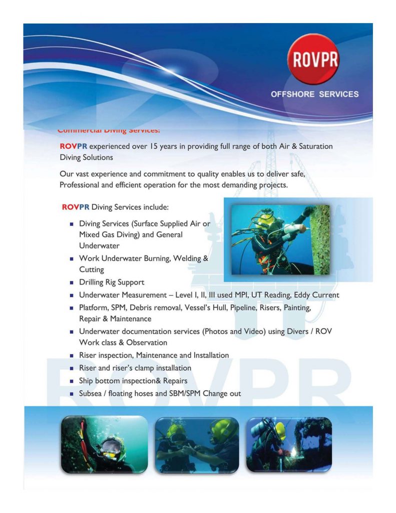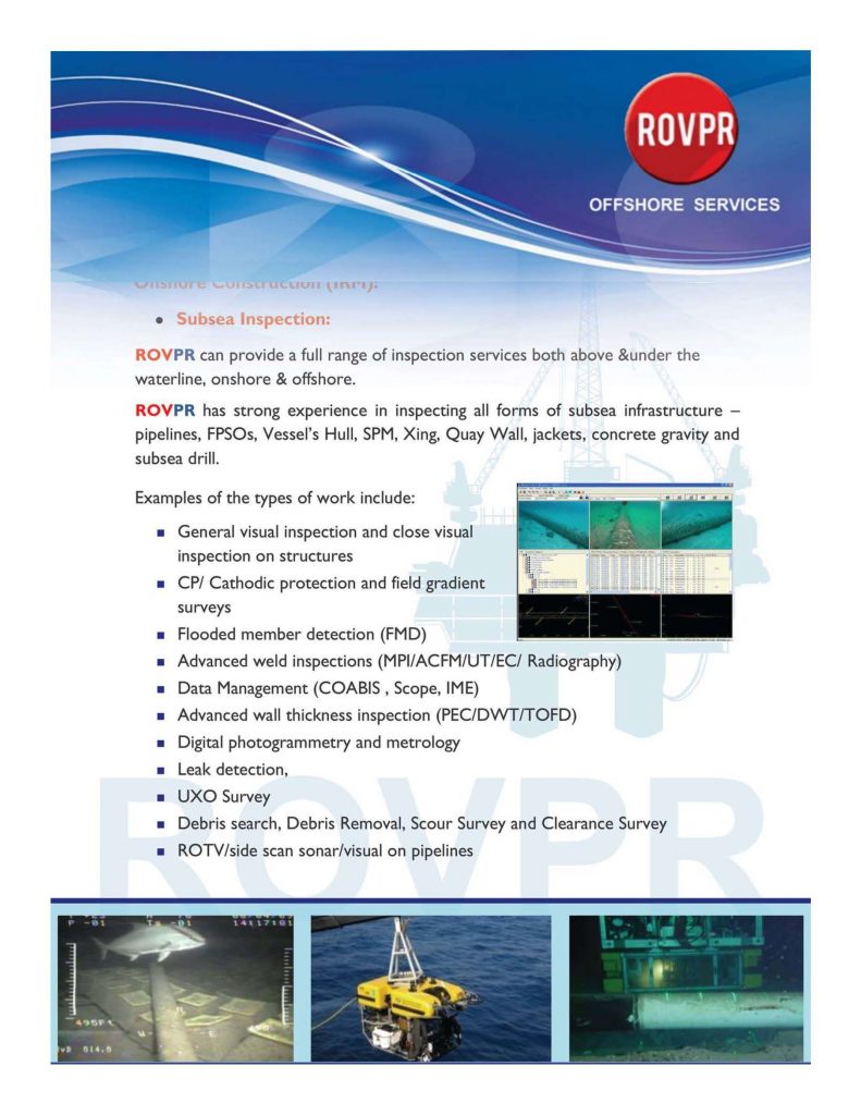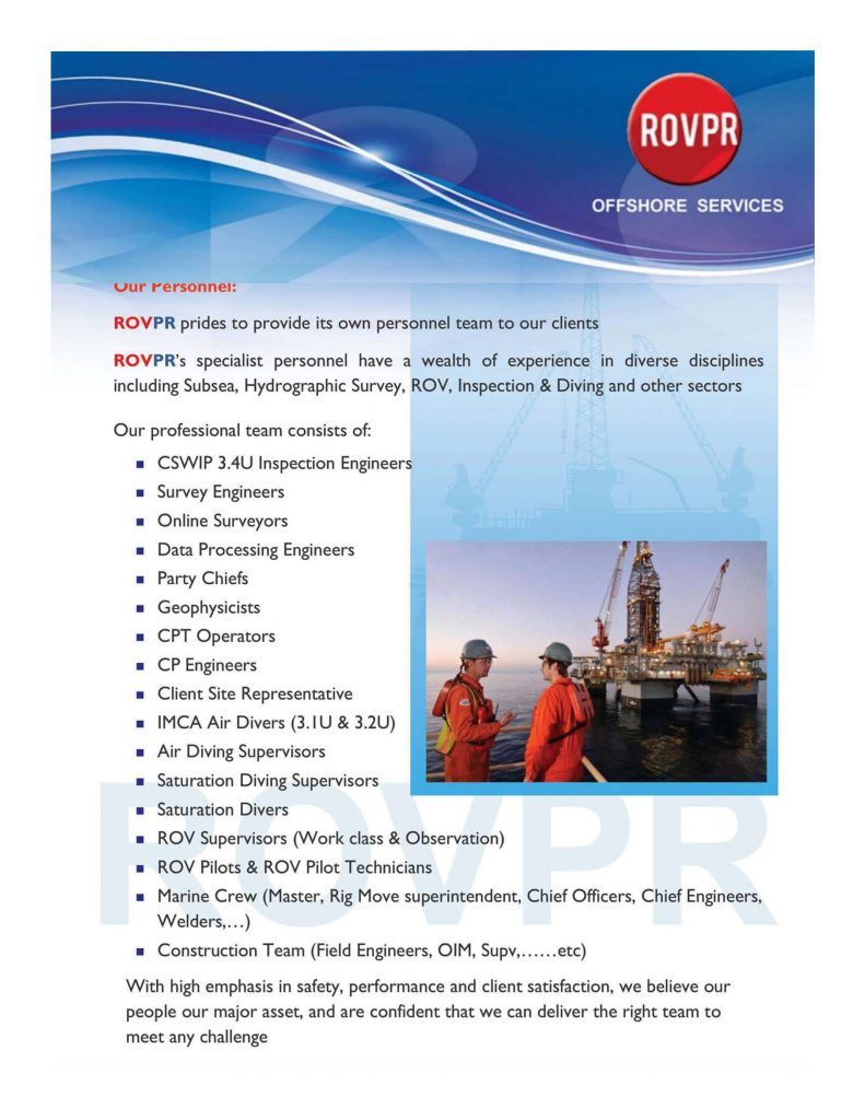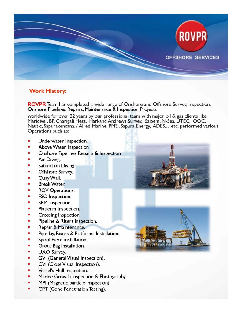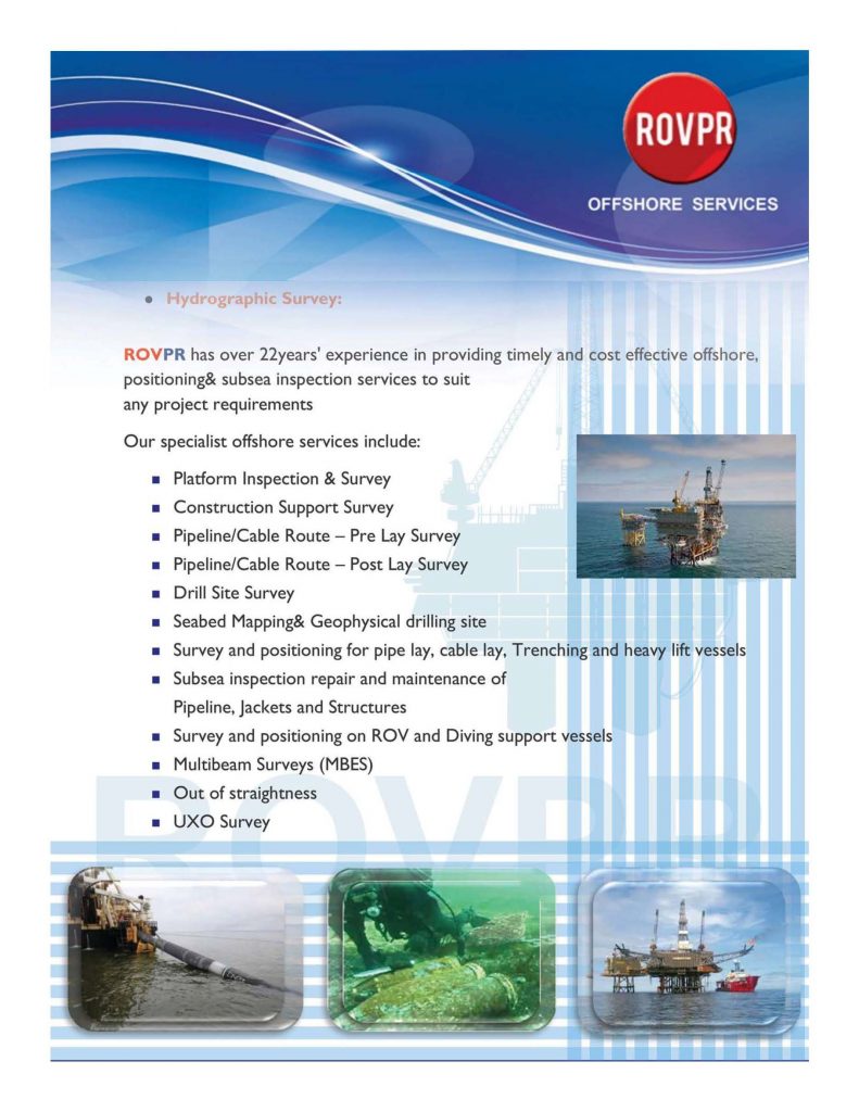 ROVPR Offshore Services Ltd Co Group One of the largest companies in the Middle East and North African Regions, providing our Equipment, Personnel & Vessels Our success story began in March 2014 when ROVPR Offshore Services team were started to work UK, Europe, EGYPT & Asia, specialized in ROV, Survey & Diving Projects for offshore oil services Clients. We have greatly expanded our operations and global footprint while accruing an enviable client base. Together with our professional team: ROVPR Offshore Services inspection engineers, survey team in diving projects, ROV projects and pipe lay projects, we have become a force to be reckoned with, in our field; a reputation for excellence and efficiency. Management of our activities in Asia, UK, Europe, Arab Gulf, Mediterranean, West Africa, Caspian Sea and Red sea is handled by ROVPR Offshore ServicesGroup , Main office in Egypt and our branch in China, While management of Arabian Gulf, India and Far East activities is run by ROVPR Offshore Services Group.
